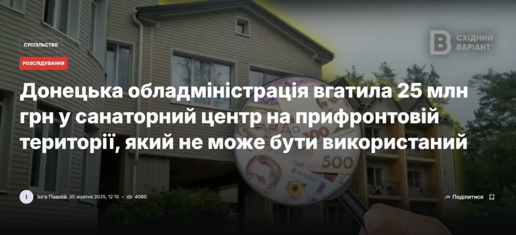 Донецька обладміністрація вгатила 25 млн грн у санаторний центр на прифронтовій території, який не може бути використаний