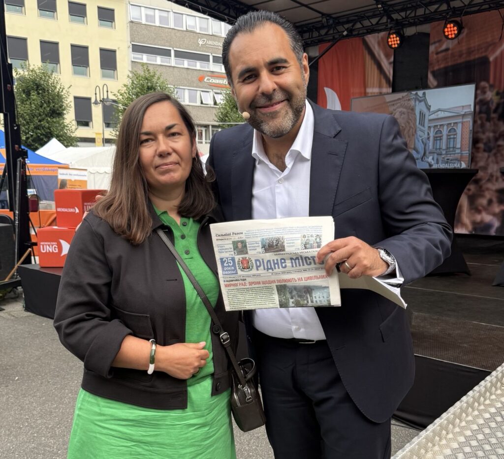 — It was fundamentally important for me to continue speaking on behalf of Ukrainian regional media. Our previous conversation with Masud Gharahkhani took place in Arendal. Back then, in August, I gave the President of Parliament a copy of the local newspaper Ridne Misto from Myrnohrad (Pokrovsk District, Donetsk Region). This time, I was again holding a fresh issue intended for local readers. However, the city has already been almost completely destroyed, — says Oksana Brovko, — says Oksana Brovko.