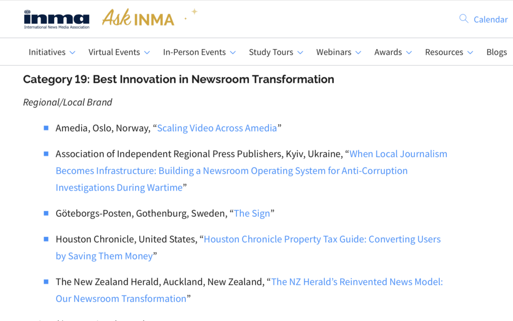 INMA Global Media Awards — одна з найстаріших і найавторитетніших нагород у медіасфері, що вже 89 років відзначає інновації у журналістиці, розвитку авдиторій, редакційних продуктах і трансформації новинних організацій. Цьогоріч до фіналу увійшли проєкти з Африки, Азійсько-Тихоокеанського регіону, Європи, Латинської та Північної Америки, а також і України, що, вважаємо, є надзвичайно важливо для нас.