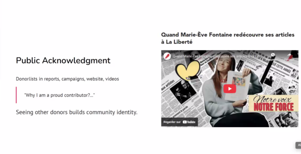 La Liberté використовує амбасадорів для залучення нових донорів поза колом читачів. Оптимістичні повідомлення: не «рятуйте газету», а «підтримайте місію». Свідчення донорів — соціальний доказ, який працює краще за маркетингові тексти.