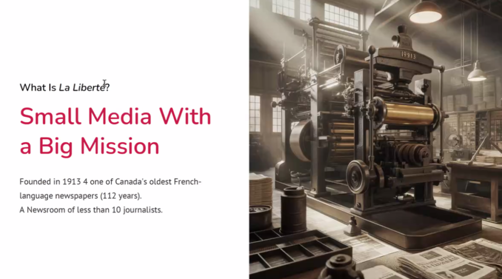 La Liberté була заснована у 1913 році для франкомовної меншини Манітоби. Попри невелику авдиторію, газета змогла перетворити її на джерело сили. У 2019 році редакція перереєструвалася як неприбуткова організація, скориставшись новим законом Канади, який дозволив газетам отримати статус благодійних.