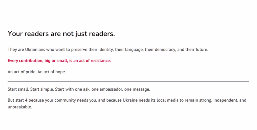 «Ваші читачі — це українці, які хочуть зберегти свою ідентичність, свою мову, свою демократію і своє майбутнє. І кожен внесок, великий чи маленький, це акт опору», — наголосила вона, акцентуючи, що медіа не варто соромитися просити свою авдиторію про підтримку.