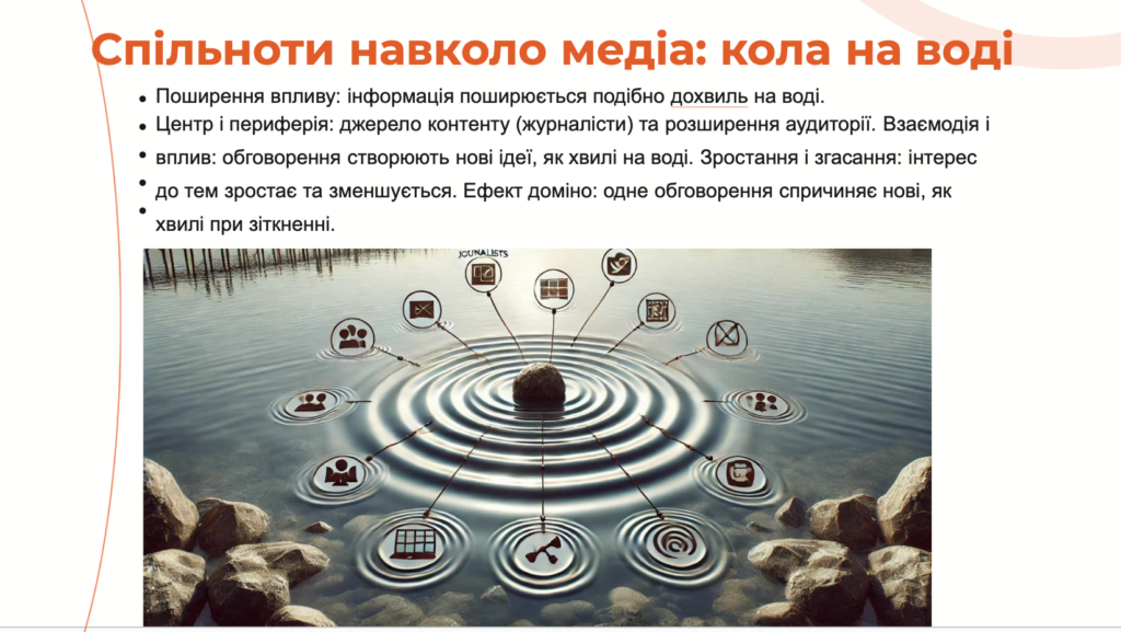 «Я почну з теорії, яку придумала сама за допомогою штучного інтелекту, про те, що спільнота — це отакі хвилі по воді. От камінець кидаєш, і воно собі хвилями несеться, і чим більше камінців, тим більша хвиля, і більший камінь — інтенсивніша хвиля», — так Наталія пояснила головну ідею своєї моделі спільноти.