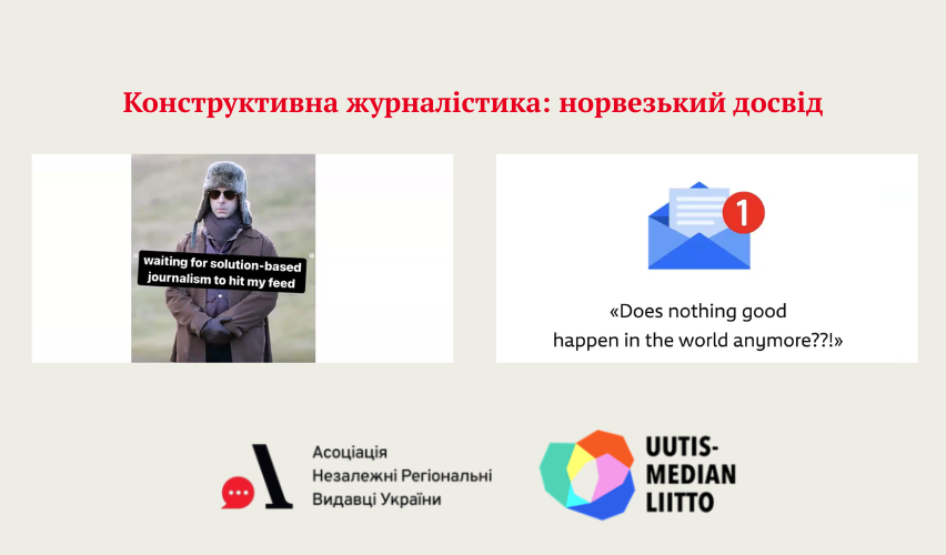 У межах програми «Медіамости: Фінляндія — Україна» продовжуємо публікувати найцікавіші виступи з воркшопів. Раніше ми писали про український досвід журналістики рішень від головної редакторки медіа «Рубрика» Марини Смагіної. Детальніше читайте в публікації «Журналістика рішень: як розповідати про проблеми так, аби надихати на зміни». Нині ж ділимося найцікавішим із досвіду Ingrid Tinmannsvik, співзасновниці demodemo.no, колишньої керівниці проєкту конструктивної журналістики суспільного мовника NRK (Norsk Rikskringkasting). Вона розповіла, як у Норвегії розвивають конструктивну журналістику та створюють нові медіа.