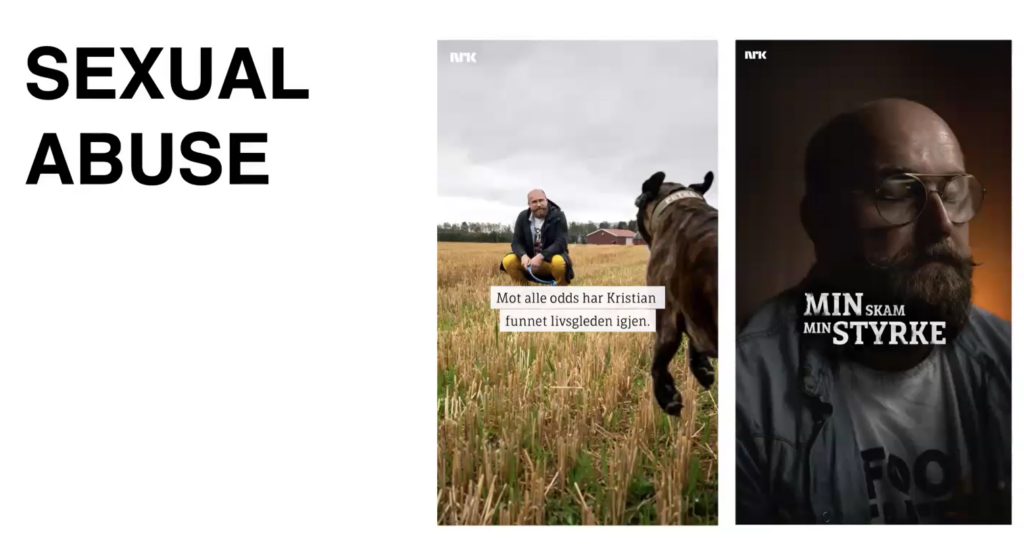 Інший сюжет торкався табуйованої теми — сексуального насильства щодо дітей. У ньому розповідалося про Крістіана, який пережив травму у п’ятирічному віці. У норвезькому суспільстві чоловіки рідко наважуються говорити про такий досвід, тому ця історія була унікальною. Журналісти подали її так, щоб вона не зводилася лише до болю: вони включили прості практичні поради і свідчення інших людей, які допомагають запобігати насильству. Це зробило матеріал читабельним і корисним.