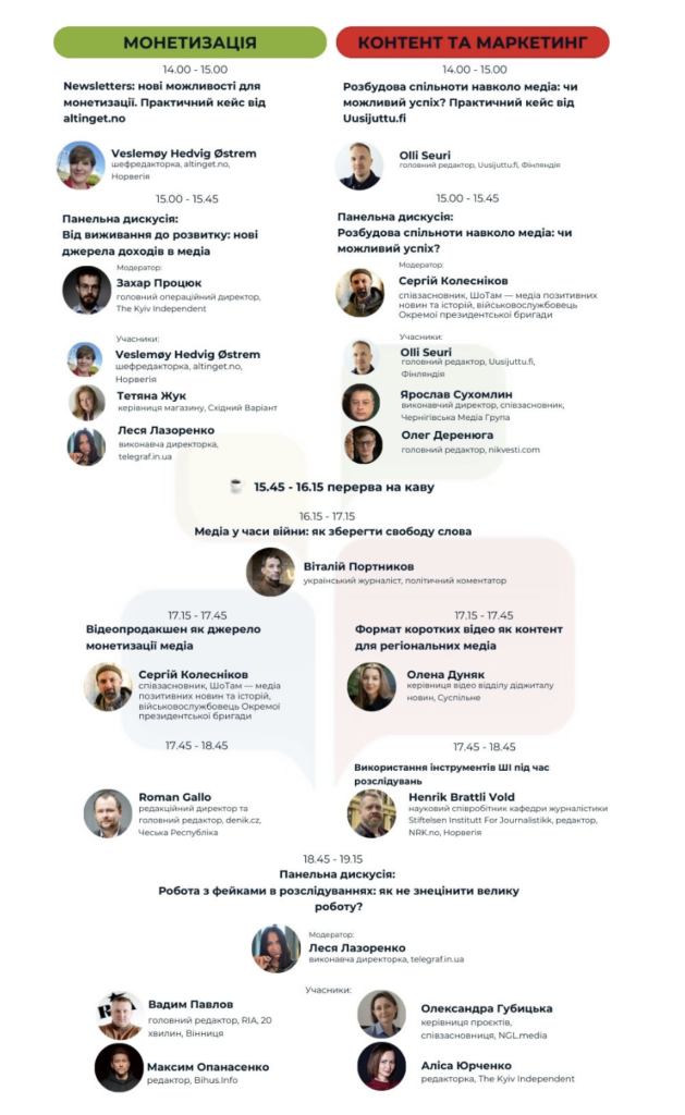 Окрему увагу приділимо напряму — «Монетизація». Бо для незалежних редакцій питання виживання нерозривно пов’язане з тим, як заробляти, не втрачаючи свободи. Тут говоритимемо і про підписні моделі, і про пейвол, і про розвиток спільнот, і про роботу з розсилками та навіть мерч. Приміром, на учасників чекає — практичний кейс від Veslemøy Hedvig Østrem,  шефредакторки в altinget.no (Норвегія), про те, як зробити розсилки стабільним джерелом доходу. А також буде виступ Романа Галло з чеського Deník про трансформацію класичних газет у мультимедійний бізнес, що теж дасть медійникам розуміння інструментів для збереження фінансової стійкості. Продовженням стане панельна дискусія, де точки дотику та бачення у цьому напрямку обговорять як закордонні, так і українські колеги. Серед тем, яка звучатиме на цьому потоці, — монетизація відеоконтенту, і надзвичайно цінним буде практичний кейс від Сергія Колеснікова, співзасновника медіа позитивних новин «Шо там».