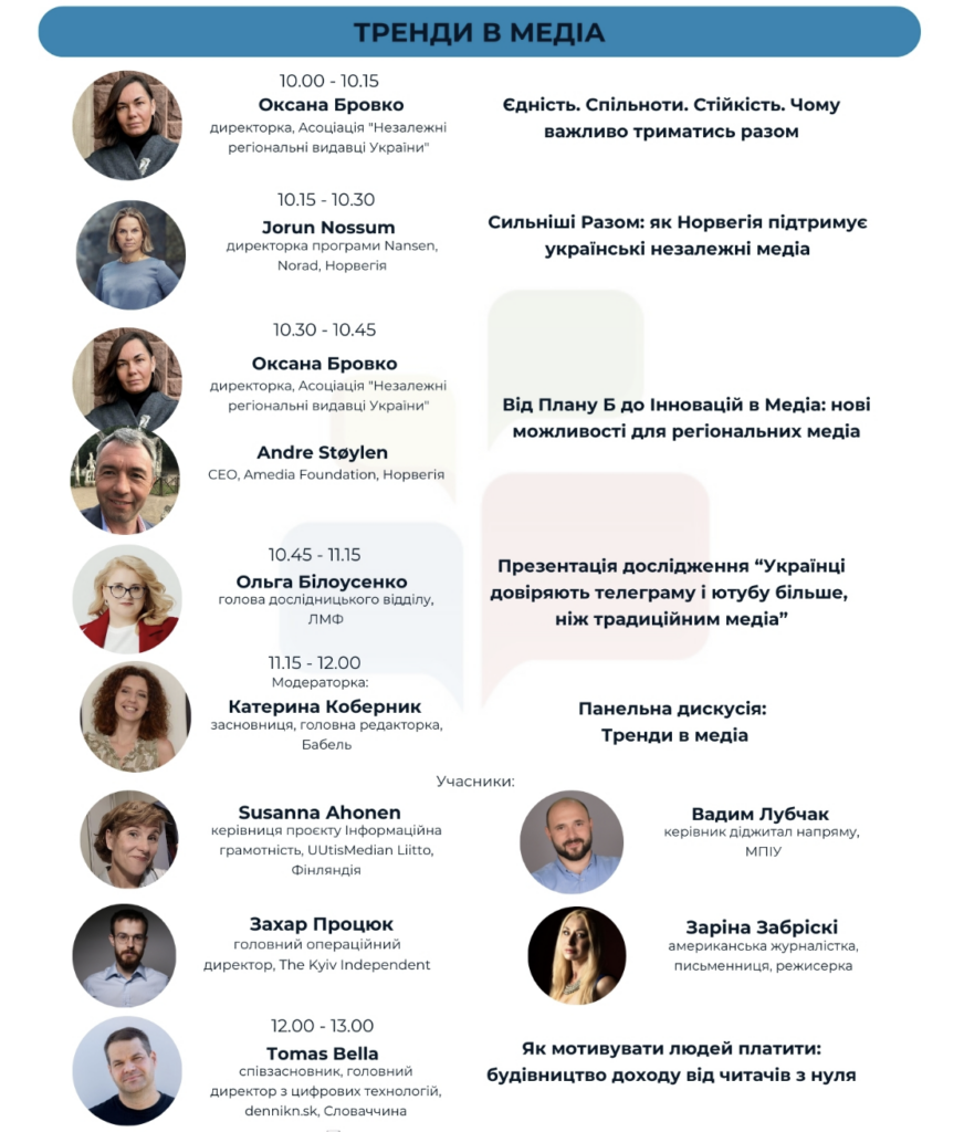 Великий блок «Тренди в медіа» відкриє дискусію про те, чому так важливо триматися разом і які є нові можливості для регіональних медіа. Тут учасники почують про підтримку української журналістики. Так, Jorun Nossum, директорка програми Nansen, Norad, розкаже про те, як Норвегія підтримує незалежні медіа та про ідею започаткування проєкту «Сильніші Разом: Медіа та Демократія».  Andre Støylen, CEO в Amedia Foundation із Норвегії, поділиться результати програми підтримки «План B» та новими можливостями для регіональних медіа України. Наш добрий друг Tomas Bella, співзасновник, головний директор з цифрових технологій, dennikn.sk зі Словаччини, розкаже про унікальний досвід, як мотивувати людей платити та будувати доходи від читачів з нуля. До речі, працівники саме цього медіа нещодавно викупили понад 70% акцій компанії.