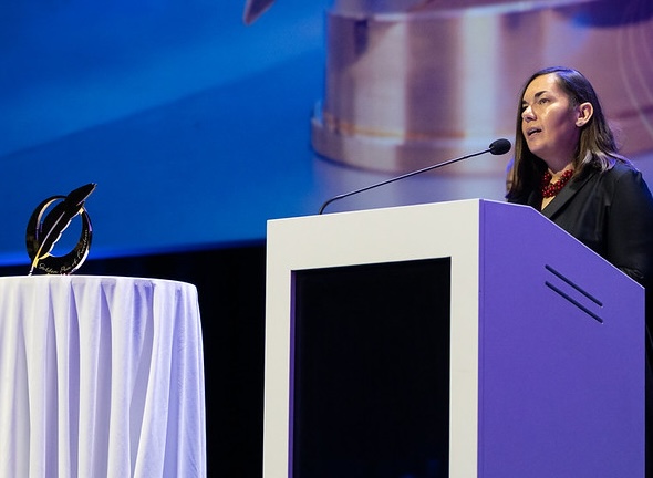 На головному фото: Оксана Бровко виголошує промову під час вручення нагороди «Золоте перо свободи» під час Всесвітнього медійного конгресу WAN-IFRA в травні 2025 року.