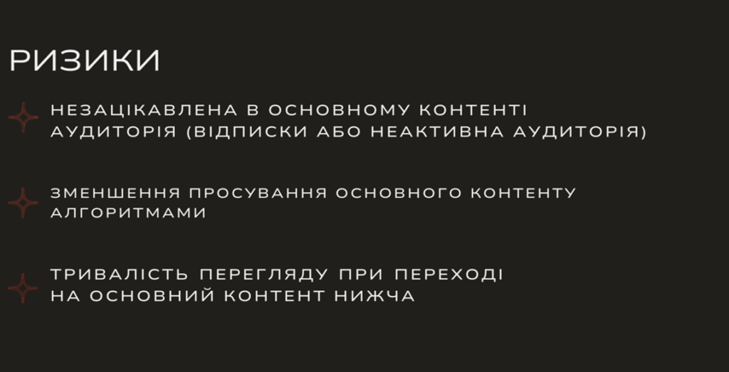 Серед ризиків — незацікавлена авдиторія, зниження просування основного контенту алгоритмами, коротка тривалість перегляду при переході. Якщо глядач не взаємодіє — це впливає на видимість каналу. Тому короткий формат потребує точного налаштування і розуміння, для кого і з якою метою він створюється.