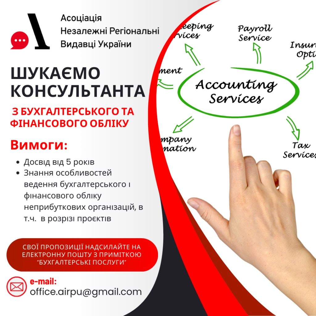 Шукаємо бухгалтера / підрядника з бухгалтерського обліку до команди Асоціації «Незалежні регіональні видавці України» (АНРВУ), який забезпечить системний фінансовий супровід організації.