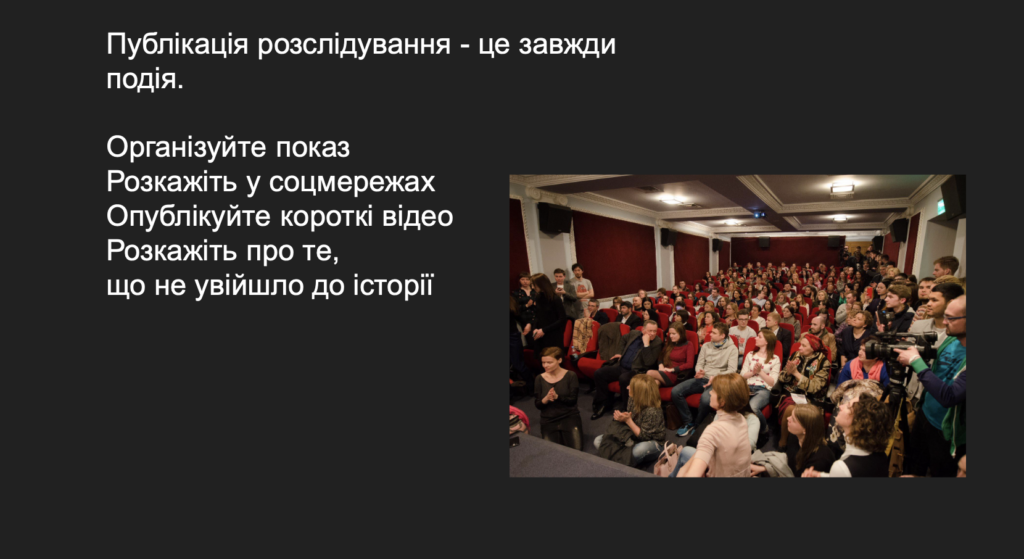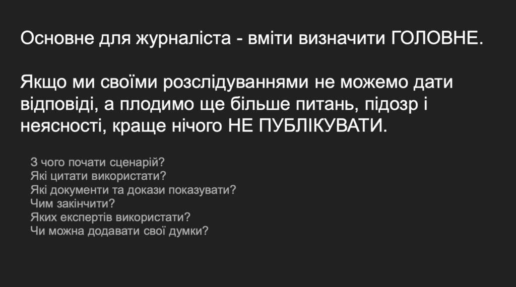 — Ми можемо щось передбачити, але основний сценарій пишеться після зібраного матеріалу, так, як це робиться для сюжету. Один зі шведських колег колись казав, що підготовка розслідування — це як приготування вечері. Ти можеш просто прийти додому, відкрити холодильник, подивитися, що в тебе є, і з цього приготувати вечерю — тоді вечеря така і буде. Або можеш вирішити, що хочеш приготувати певну страву, купити всі продукти й уже з них готувати. Так само і з розслідуванням. Якщо є можливість завчасно написати сценарій — це супер-класно. Але переважно основний сценарій, за яким відбувається монтаж, пишеться після зібрання всіх даних, — пояснила вона.