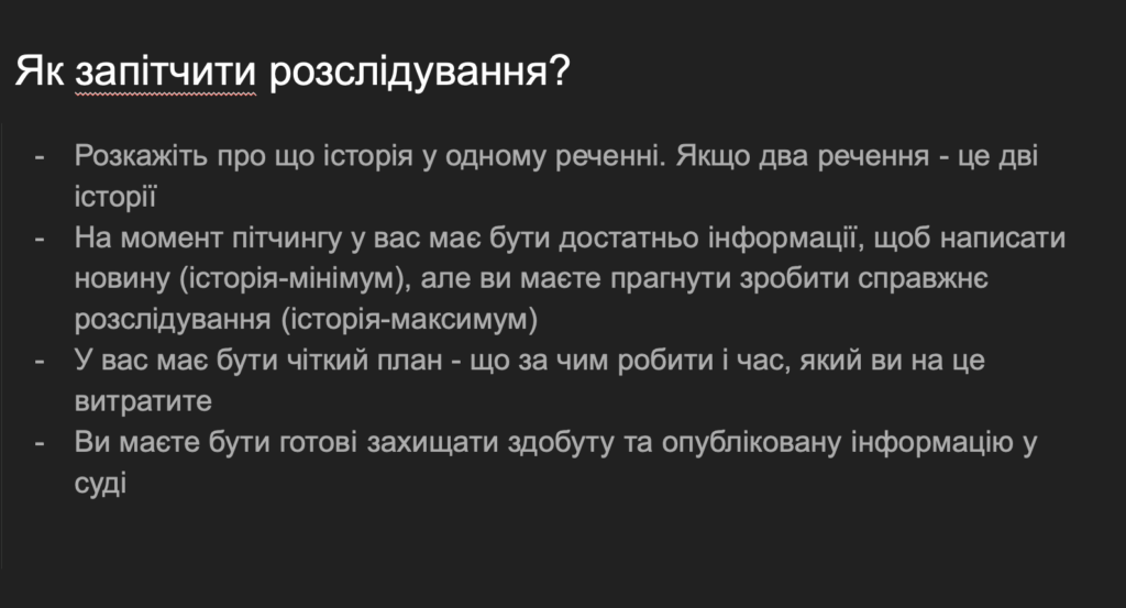 Анна радить чітко формулювати ідею розслідування: «Історія, яку ми розповідаємо, має бути розказана в одному реченні. Якщо два речення — це дві історії».