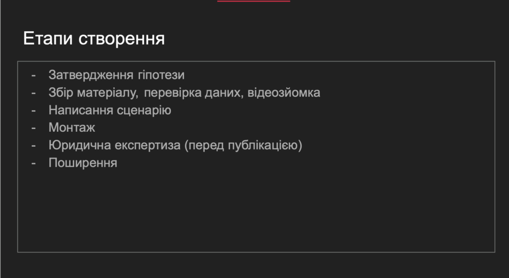 «Ми вважаємо, що ось ця людина ікс крала ікс суму грошей. Це наша гіпотеза, але вона з чогось має виходити — не тільки з нашої голови. Далі перевіряємо певні вихідні дані, чи з тим можна працювати, чи ця гіпотеза вже має підґрунтя. Ми її затверджуємо і починаємо працювати. Далі збираємо матеріали, перевіряємо дані. Потім пишемо сценарій».