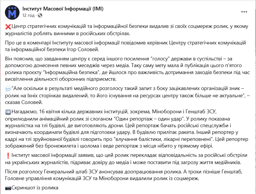 Днями медійна спільнота жваво обговорювала анімаційний ролик, виготовлений Центром стратегічних комунікацій та інформаційної безпеки (Стратком) спільно із Генеральним штабом ЗСУ та оприлюднений у соцмережах. Реакція медійників була переважно критичною: «Створили негативну репутацію саме журналістам»; «Тепер вороги — медіа»; «Тепер у прильотах звинуватили журналістів», «Це перекладання вини за війну на медіа» тощо.