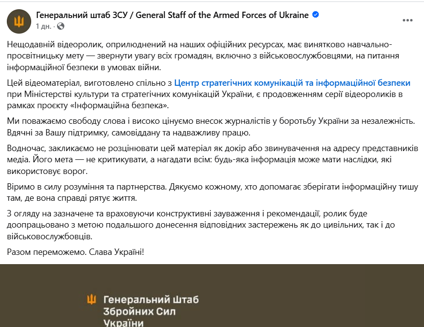У відповідь на критику та обурення Генеральний штаб на сторінці у фейсбуку заявив, що метою ролика було «звернути увагу всіх громадян, включно з військовослужбовцями, на питання інформаційної безпеки в умовах війни». І закликав «не розцінювати цей матеріал як докір або звинувачення на адресу представників медіа. Його мета — не критикувати, а нагадати всім: будь-яка інформація може мати наслідки, які використовує ворог».