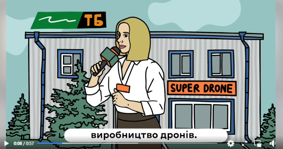 Далі вмикається журналістка (білявка із брендованим мікрофоном) і каже: «Україна нарощує виробництво дронів. Залучає цивільні підприємства. Ось тут виготовляють сотні безпілотників щомісяця».