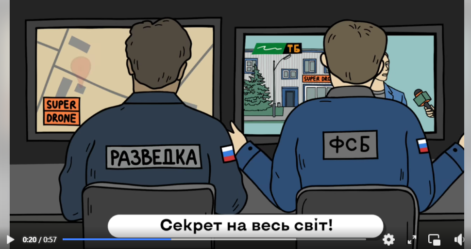 Двоє чоловіків сидять спинами до глядача, на спинах написи російською «Разведка» та «ФСБ», вони говорять російською, закадровий голос перекладає українською: «Секрет на весь світ. Дякуємо, важлива ціль. Передаємо дані штабу. Готуємо удар».