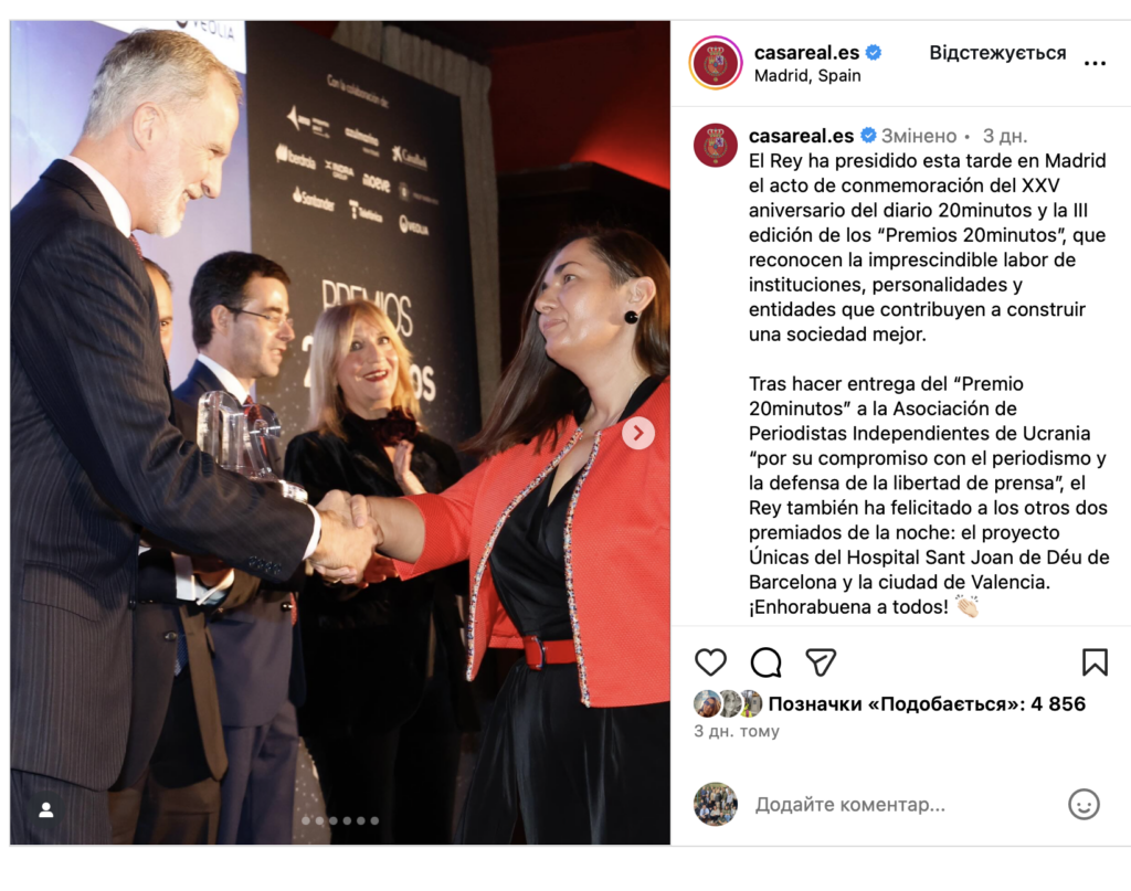Детальніше про церемонію нагородження читайте тут: Король Іспанії Філіп VI вручив нагороду Оксані Бровко за внесок у розвиток незалежних медіа України