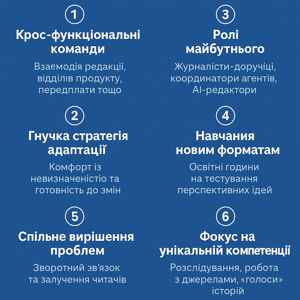 Ключ до інновацій — кросфункціональні команди, що об’єднують редакцію, продукт, технічний блок і підписки. Інновації мають бути прозорими: регулярні шеринги, відкриті зустрічі створюють культурний зсув усього ньюзруму — від окремих експериментів до спільної трансформації.