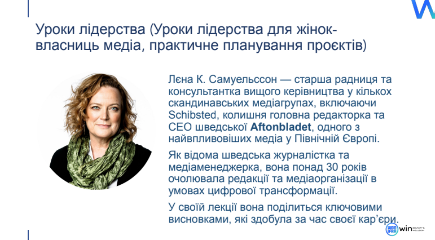 - Уроки лідерства (уроки для власниць медіа, практичне планування проєктів), Лєна Самуельссон,