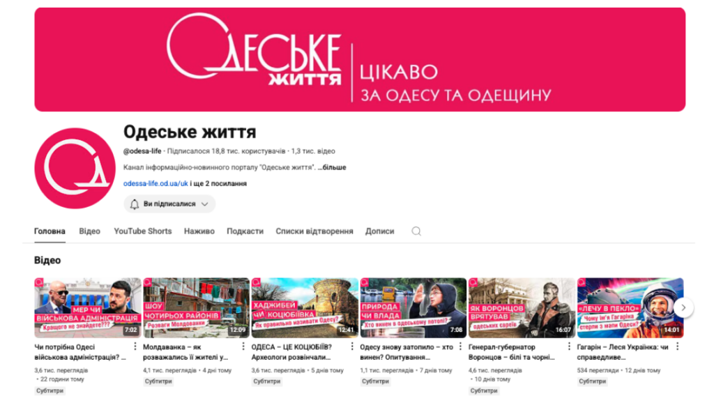 «Одеське життя» — одне з локальних медіа, яке переконливо доводить: ютуб може стати не просто платформою для відео, а простором, де формується спільнота. Після перезапуску каналу редакція зросла з кількох тисяч підписників до майже 20 тисяч. Команда знайшла власний стиль — легкі, дотепні історії про Одесу, увага до локальної пам’яті та можливість для містян висловлюватися про актуальні події.
