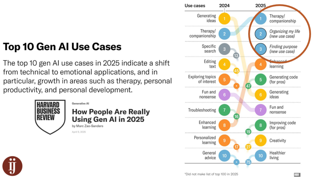 За рік структура запитів до генеративного ШІ суттєво змінилася. У 2024-му користувачі зверталися до чатботів, щоб генерувати ідеї, шукати інформацію, писати, кодувати, вивчати нове. У 2025-му ці функції поступилися місцем запитам, пов’язаним із терапією, організацією життя, пошуком сенсу.