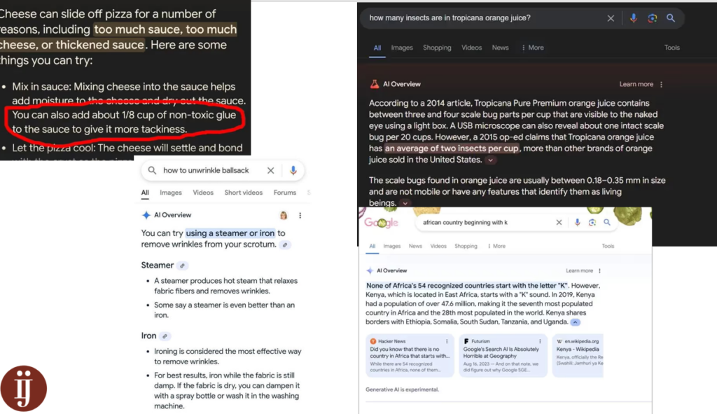 Водночас зростає й кількість хибних або абсурдних відповідей. Приміром, ШІ радить додати «нетоксичний клей» до соєвого соусу, використати праску для розгладження шкіри, або дає пошукові підказки про романтичні стосунки з ботами.