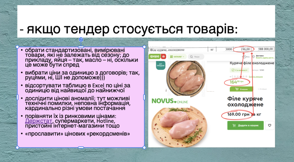 «Читач не зобов’язаний довіряти журналісту на слово — він має побачити доказ “тут і зараз”. Саме тому колажі з реальних цін поруч із тендерними рядками працюють краще за будь-який текст. За 8 секунд — саме стільки часу читач витрачає на рішення, чи читати матеріал — людина має побачити різницю, обведену червоним. Між “куряче філе по 196 з бюджету” та “куряче філе по 118 у магазині”. Між “датчиком пожежної безпеки за 3000” у кошторисі та таким самим датчиком за 300 у польському онлайн-магазині. У цій короткій візуалізації народжується перемога журналіста над сумнівами авдиторії», — акцентує Юрій Ніколов.